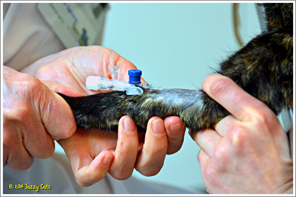 Van Puck's linker voorpoot is wat haar weggeschoren, zodat de leidingen met bloed goed zichtbaar worden. In zo'n leiding wordt vervolgens een kraantje (braunule) geschoven om extra kunstslaap toe te dienen, of water zodat ze niet uitdroogt.