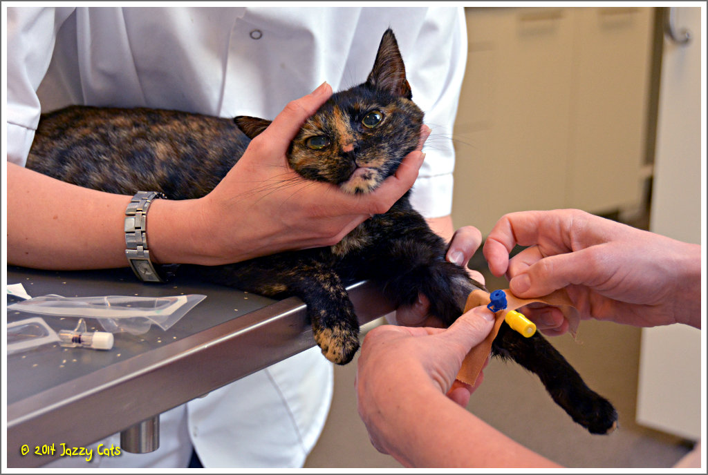 Het kraantje wordt met pleisters goed vastgezet, Puck heeft hier geen weet meer van, ze is in kunstslaapland. Tijdens de operatie blijven haar ogen open, daarom heeft ze speciale oogdruppels gekregen tegen droge ogen.