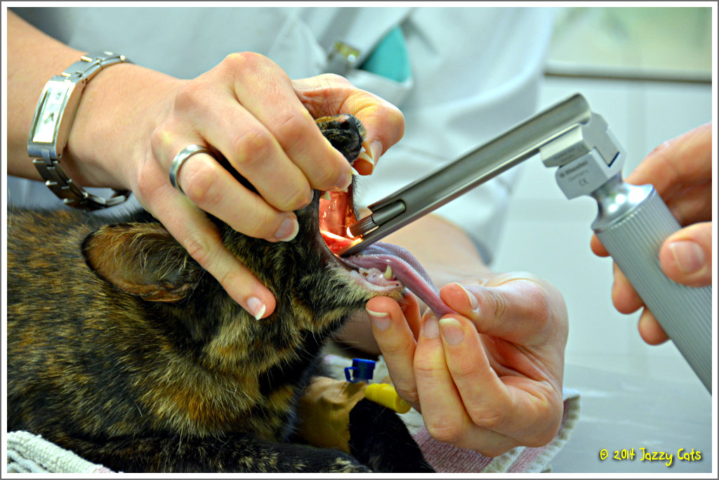 Puck is overgebracht naar de operatiekamer en daar wordt eerst haar slikkanaal met een speciale lamp op een stokje bekeken. Als het spuugcomplex heel erg is, kan het hele kanaal ontstoken zijn.
