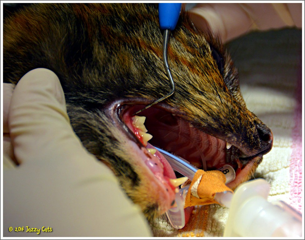 Met een speciaal meetinstrument wordt de diepte van de ruimte tussen Puck's kiezen en kaak gemeten, de pocketdiepte.