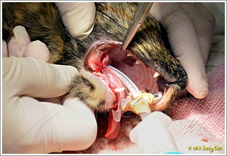 Als alle kiezen uit Puck's onderkaak zijn verdwenen, wordt het tandvlees weer terug gevouwen en netjes aan elkaar gezet met naald en draad. Anders zouden er misschien nog brokjes verdwijnen in de ontstane gaten en dat is zonde.